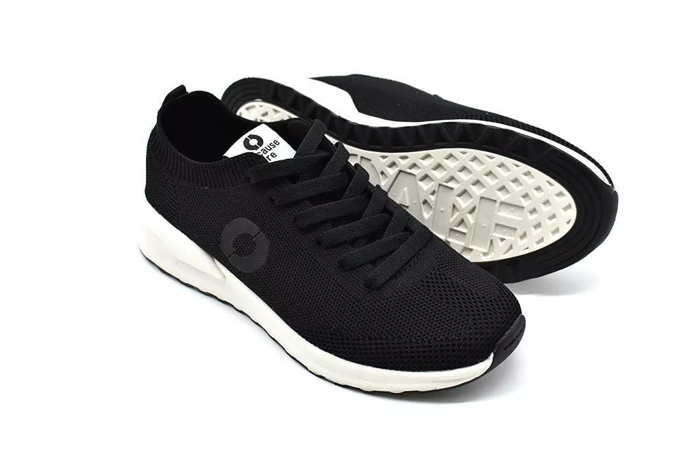 Las sencillas zapatillas negras con parte superior de punto son cómodas y, gracias a los materiales reciclados utilizados, muy ligeras. El diseño sencillo combina con cualquier atuendo.