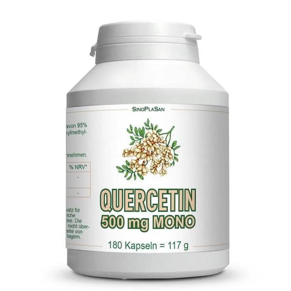 Quercetina 500 mg MONO de SinoPlaSan es un suplemento dietético especializado diseñado para apoyar su salud con quercetina, un potente flavonoide conocido por sus propiedades antioxidantes y antiinflamatorias. Este producto ofrece una dosis efectiva de 500 mg de quercetina por cápsula y contiene un total de 180 cápsulas, asegurando un suministro a largo plazo y una cómoda dosificación.